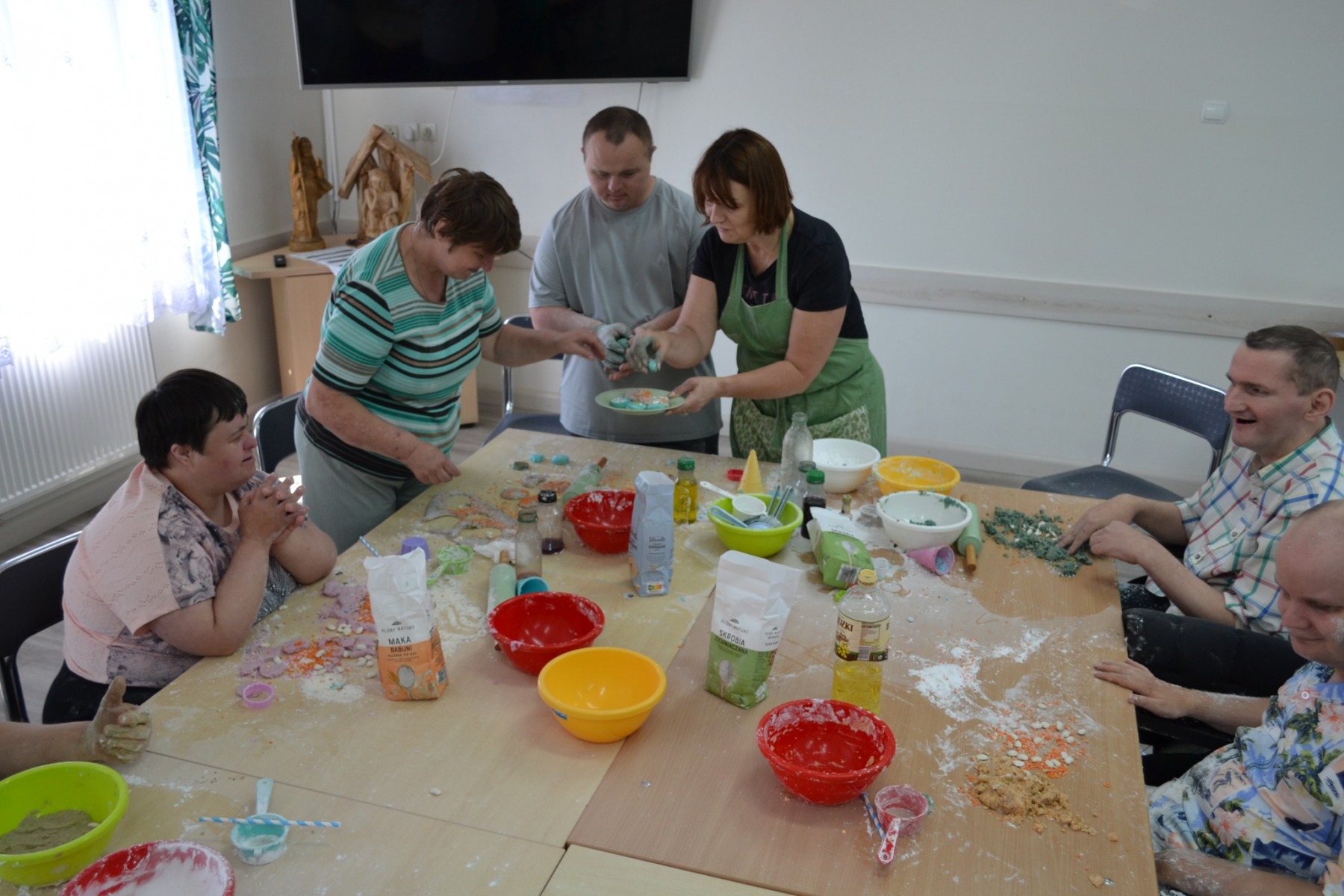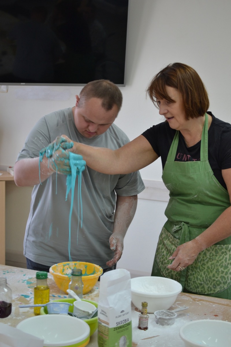 W naszym ośrodku gościliśmy Panią Alinę, która zaprezentowała nam bardzo ciekawe zajęcia z sensoplastyki. Sensoplastyka to forma zajęć dzięki którym możemy rozwijać kreatywność, wyobraźnię, motorykę małą, integrację sensoryczną oraz umiejętności społeczne. Podczas zajęć uczestnicy mogli doświadczać kontaktu z różnymi materiałami i fakturami m.in. z mąką ziemniaczana, mąką pszenną, grochem, soczewicą, czy płatkami owsianymi. Z wymienionych produktów spożywczych uczestnicy tworzyli masy plastyczne, lepili, ugniatali mieszali. Zajęcia te przyniosły wszystkim uczestnikom wiele radości i satysfakcji.
